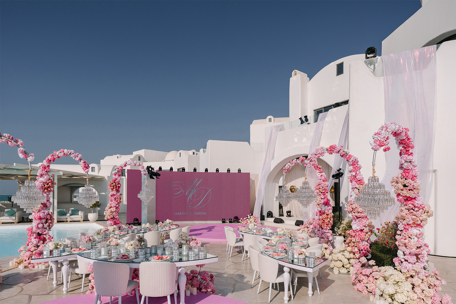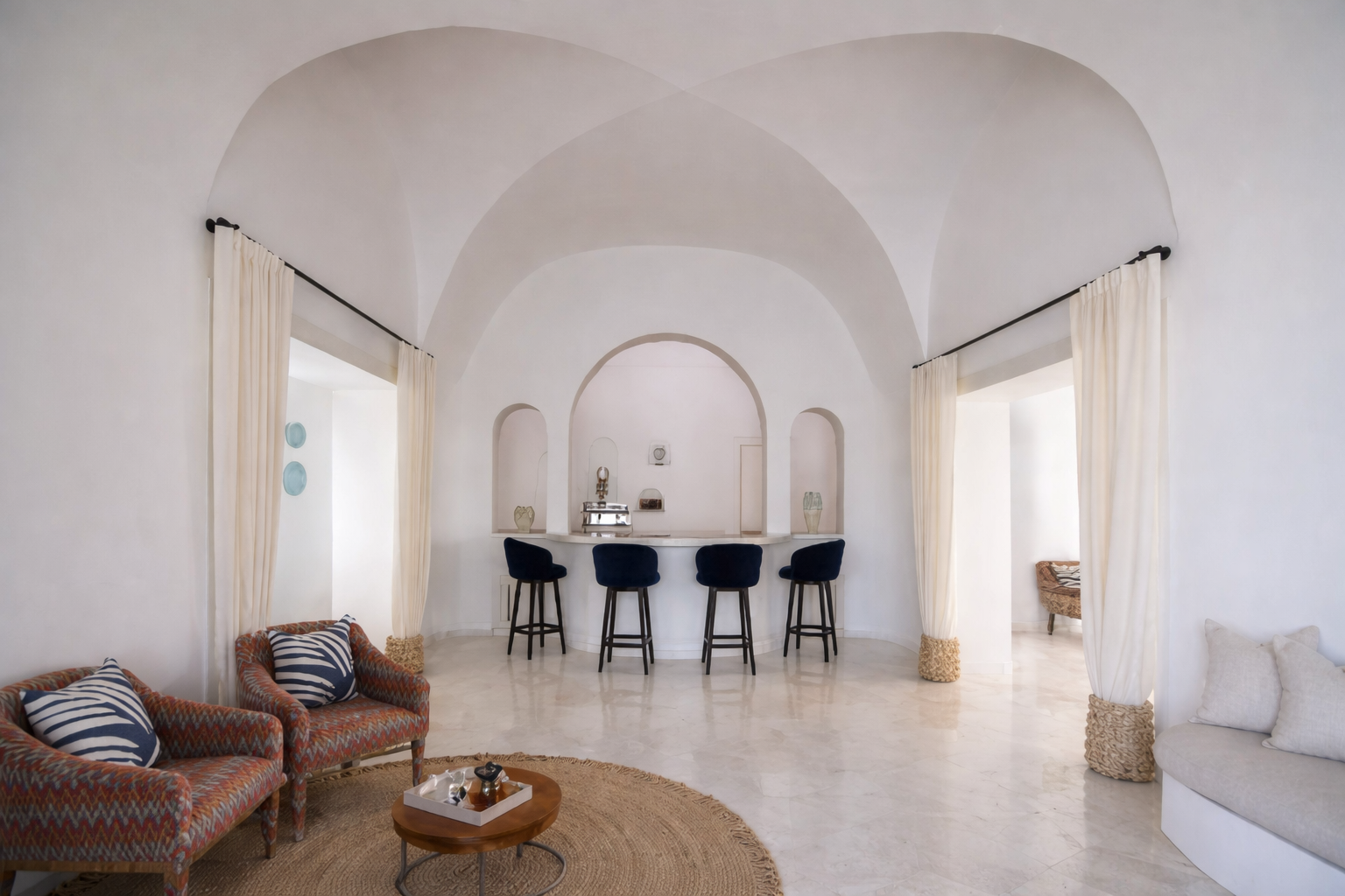 The retreat features just 22 refined rooms, all of which can be exclusively reserved for your celebration. This is its greatest advantage — your wedding does not begin with the banquet; it begins the moment your guests arrive. You may prepare welcome gifts, personalize each room in harmony with your wedding concept, and curate every detail of the experience. On your special day, there will be no outside guests — only your closest circle within a private world of white domes, arches, cascading staircases, and endless sea panoramas.