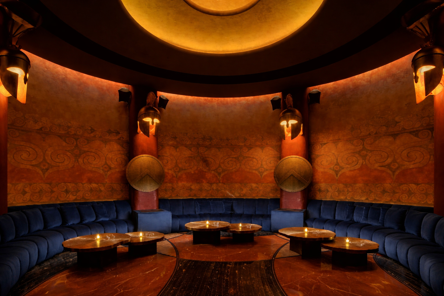 The festive atmosphere is further enhanced by Thalassa, the resort’s Greek restaurant, or OIA Oasis, the tranquil spa complex, or even a private screening in the luxurious cinema featuring velvet daybed-style seating.